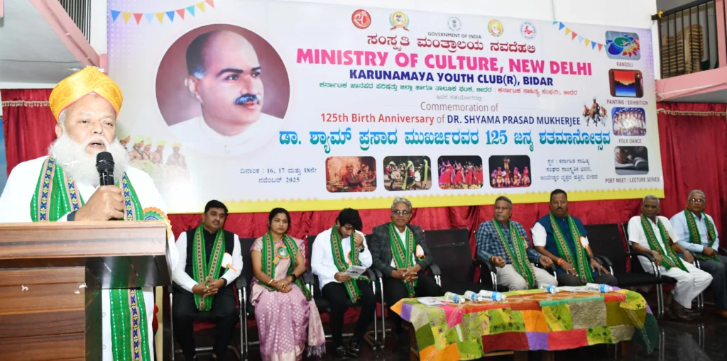 ಬೀದರ್ ನಗರದ ಕರ್ನಾಟಕ ಸಾಹಿತ್ಯ ಸಂಘದ ಸಾಂಸ್ಕøತಿಕ ಭವನದಲ್ಲಿ ನ. 18 ರಂದು ಸಂಸ್ಕøತಿ ಮಂತ್ರಾಲಯ ನವದೆಹಲಿ, ಕರುಣಾಮಯ ಯುವಕ ಸಂಘ ನಾವದಗೇರಿ, ಕರ್ನಾಟಕ ಜಾನಪದ ಪರಿಷತ್ತು ಹಾಗೂ ಕರ್ನಾಟಕ ಸಾಹಿತ್ಯ ಸಂಘದ ಸಂಯುಕ್ತಾಶ್ರಯದಲ್ಲಿ ನಡೆದ ಡಾ. ಶ್ಯಾಮಪ್ರಸಾದ ಮುಖರ್ಜಿಯವರ 125ನೇ ಜನ್ಮಶತಮಾನೋತ್ಸವ ಸಮಾರಂಭದಲ್ಲಿ ಸನ್ಮಾನಿತರಾಗಿ ಅವರು ಮಾತನಾಡಿದರು.